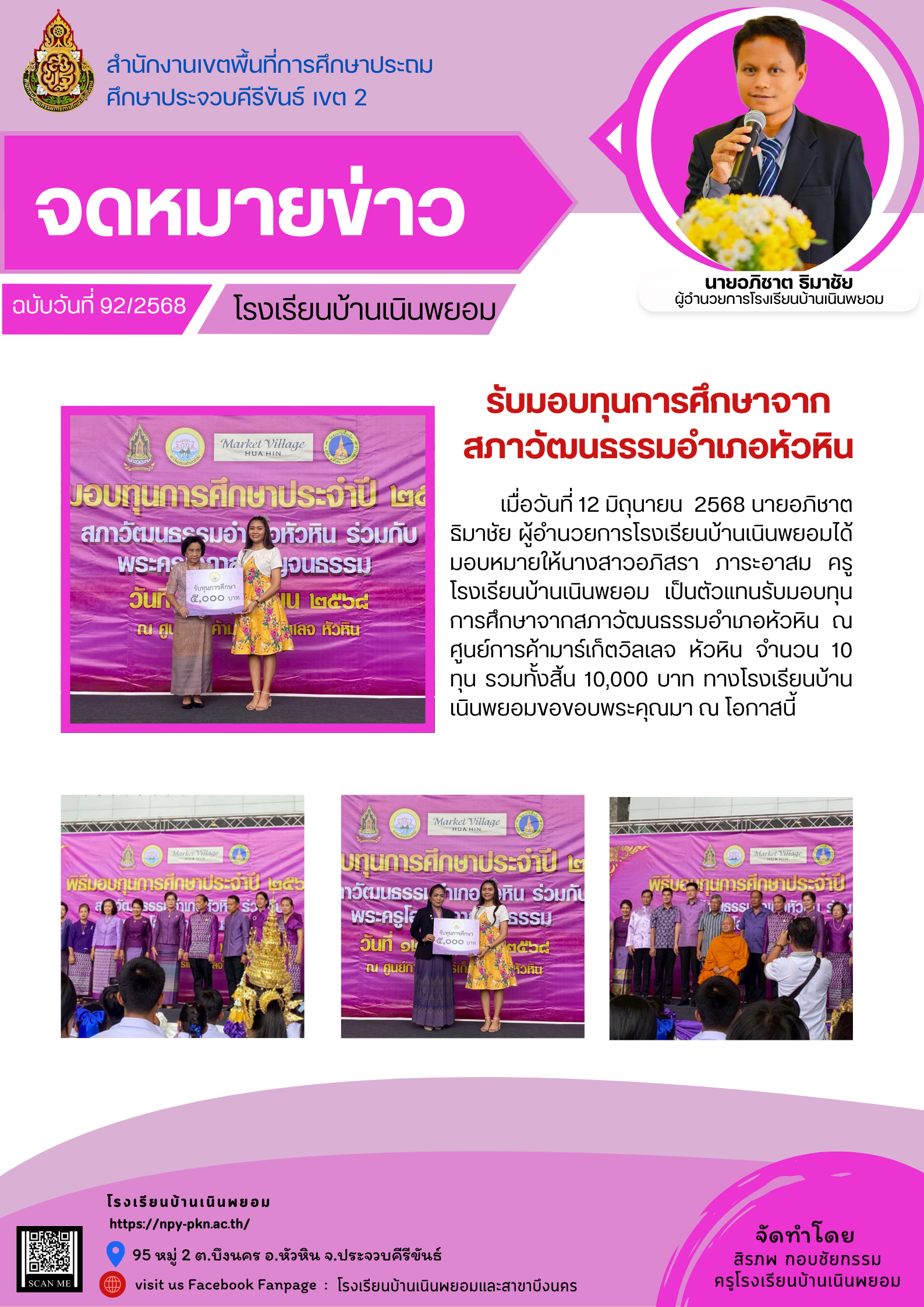 รับมอบทุนการศึกษาจาก สภาวัฒนธรรมอำเภอหัวหิน